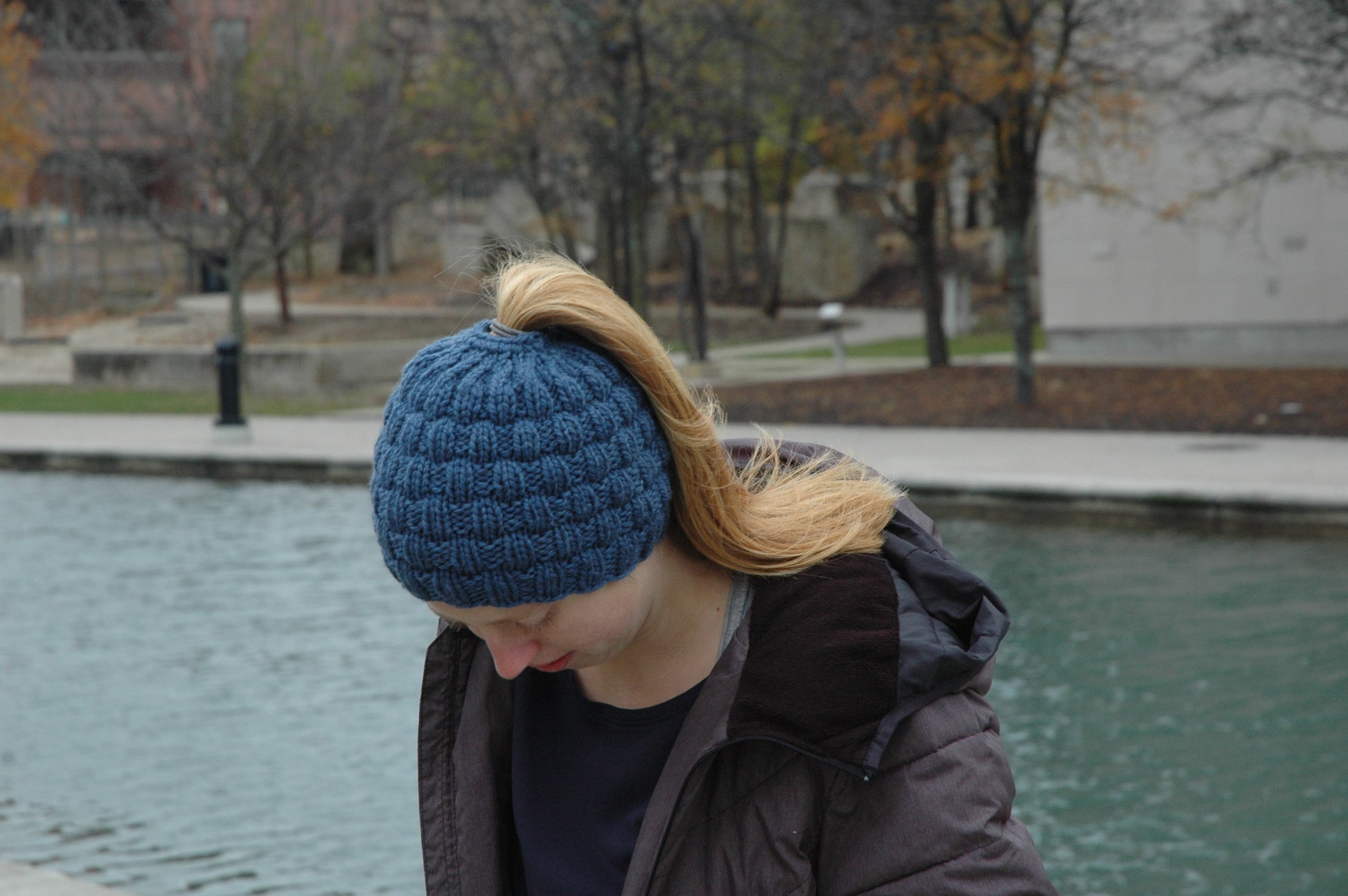 The new hat this season features a hole in the top to pull a messy bun or ponytail through. A elastic ponytail holder is crocheted to the opening to securely hold the bun or ponytail
