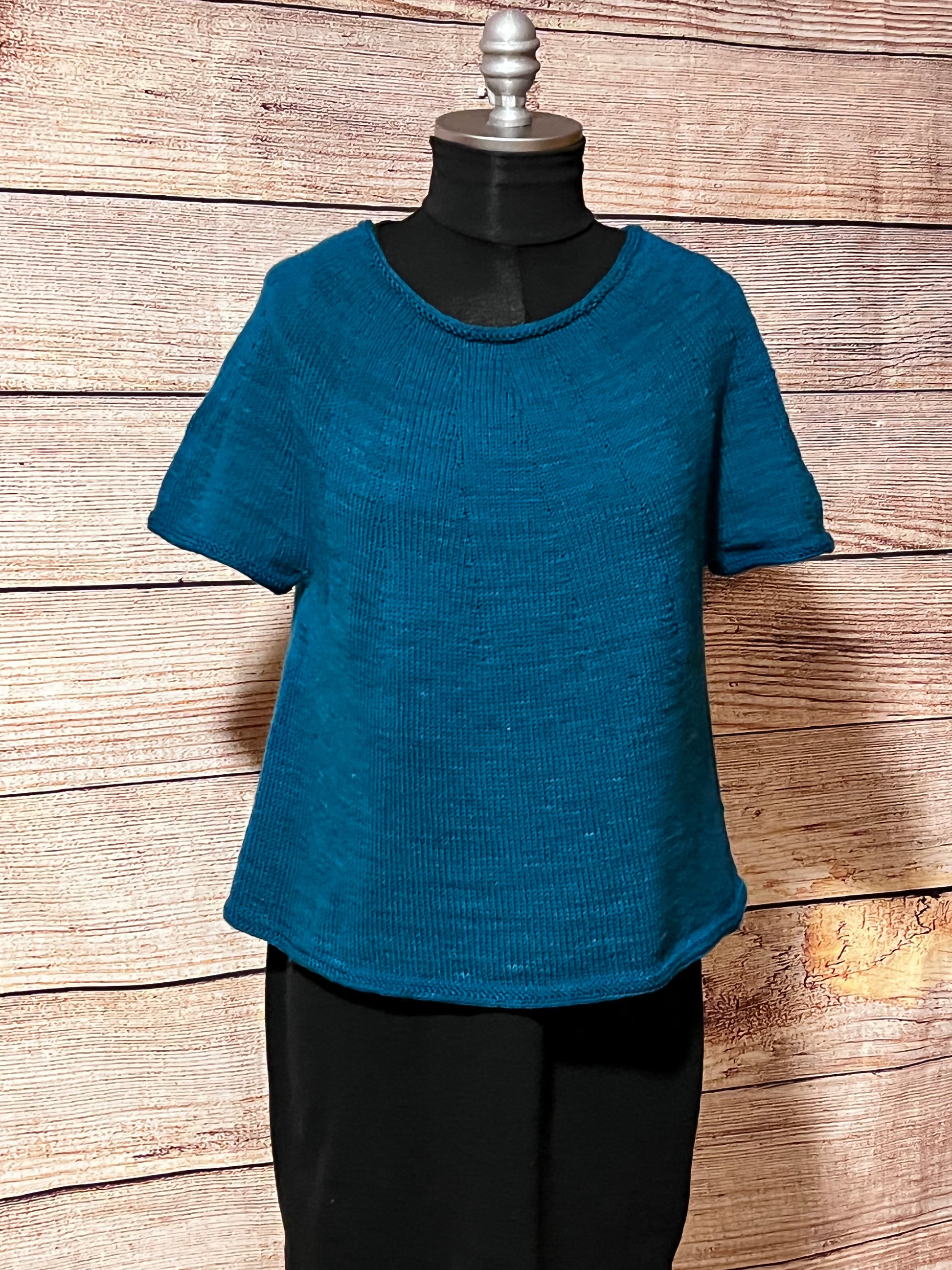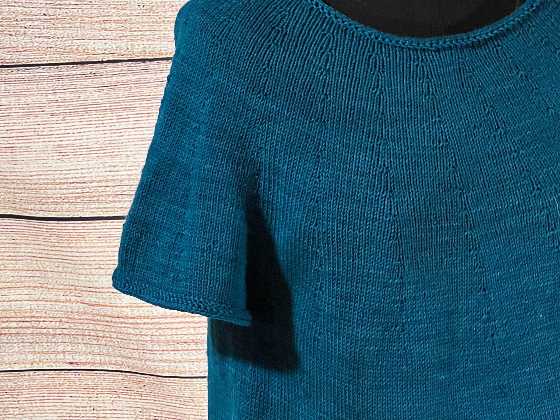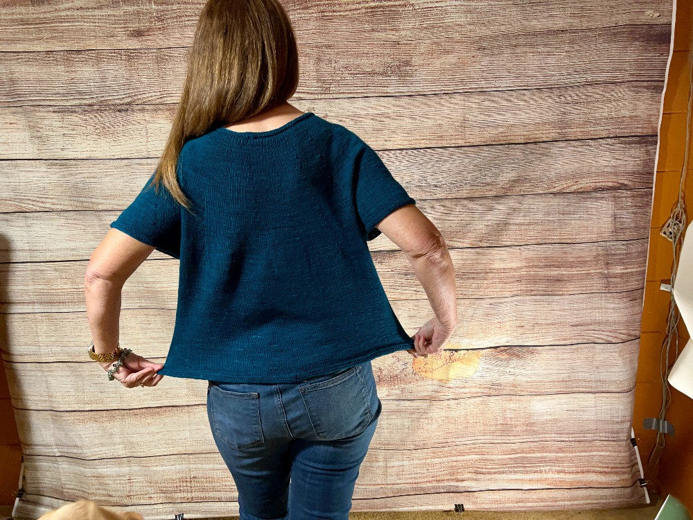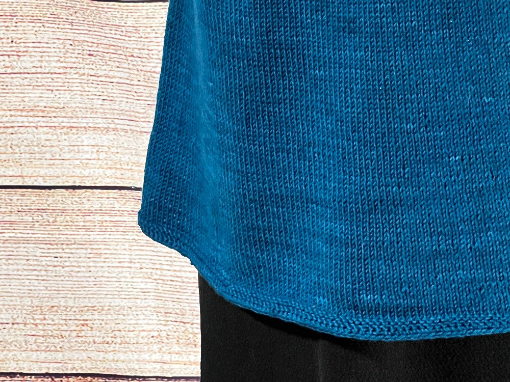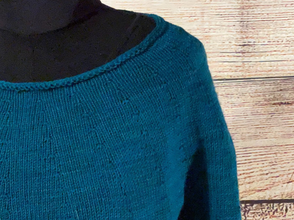 The sweater is worked in stockinette stitch. The hem and sleeves are finished with garter stitch followed by an I-cord BO. The pullover, including the sleeves, has positive ease for a breezy and comfortable fit.