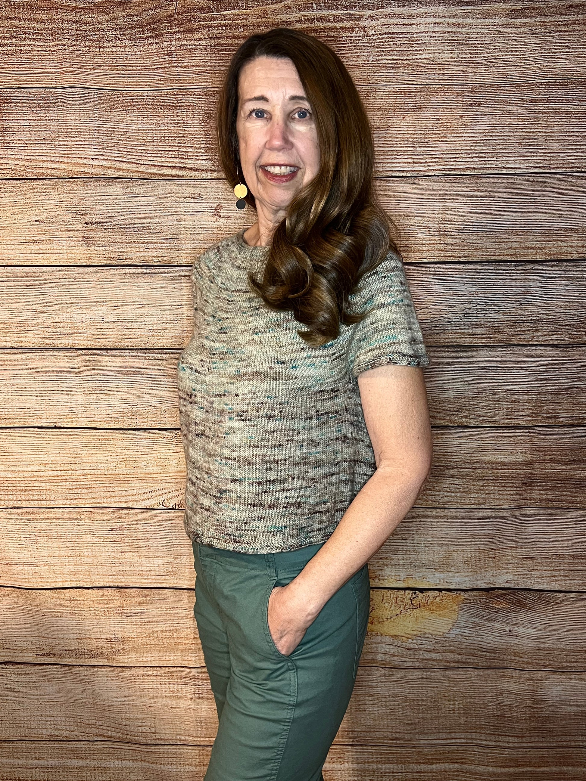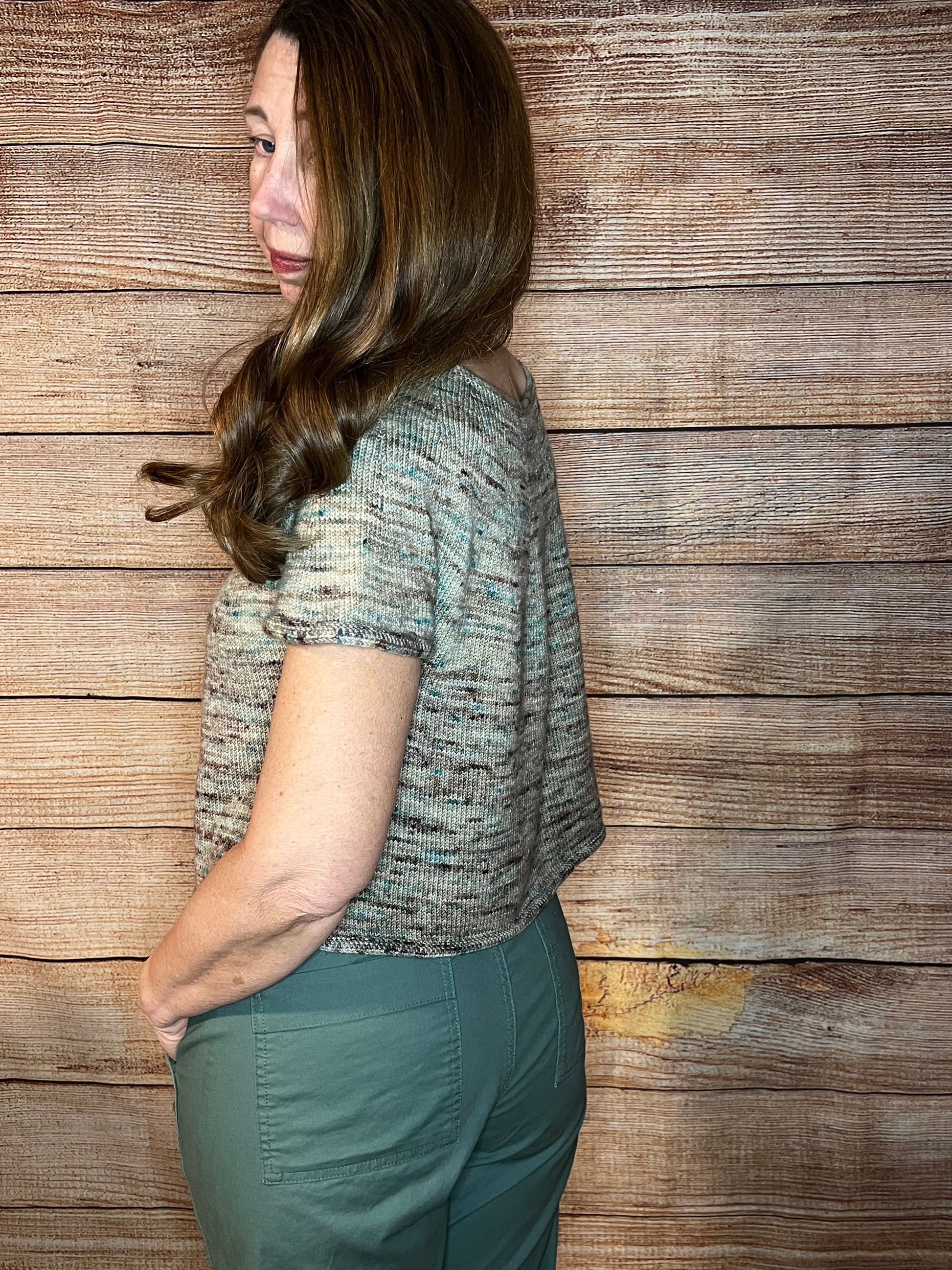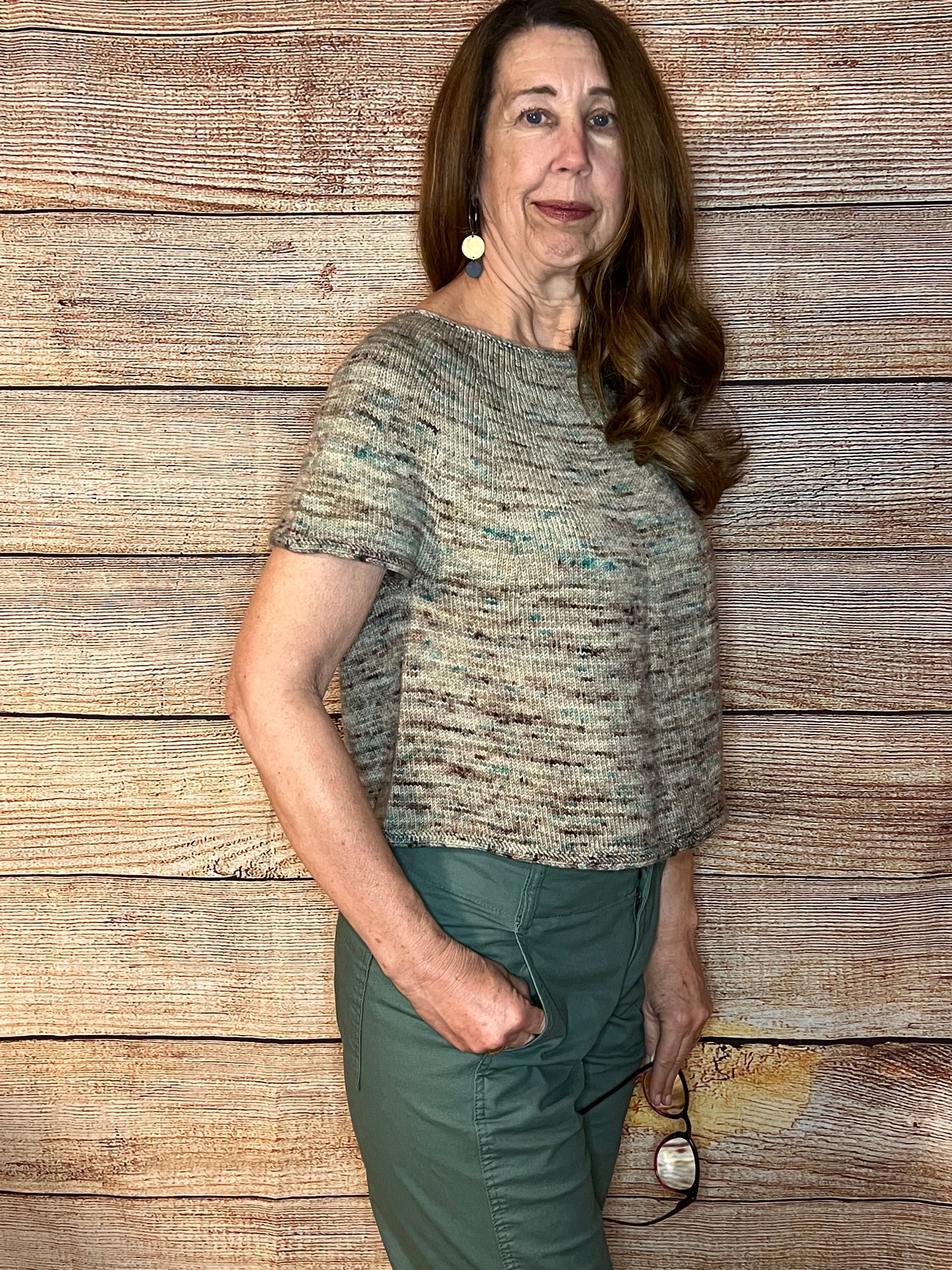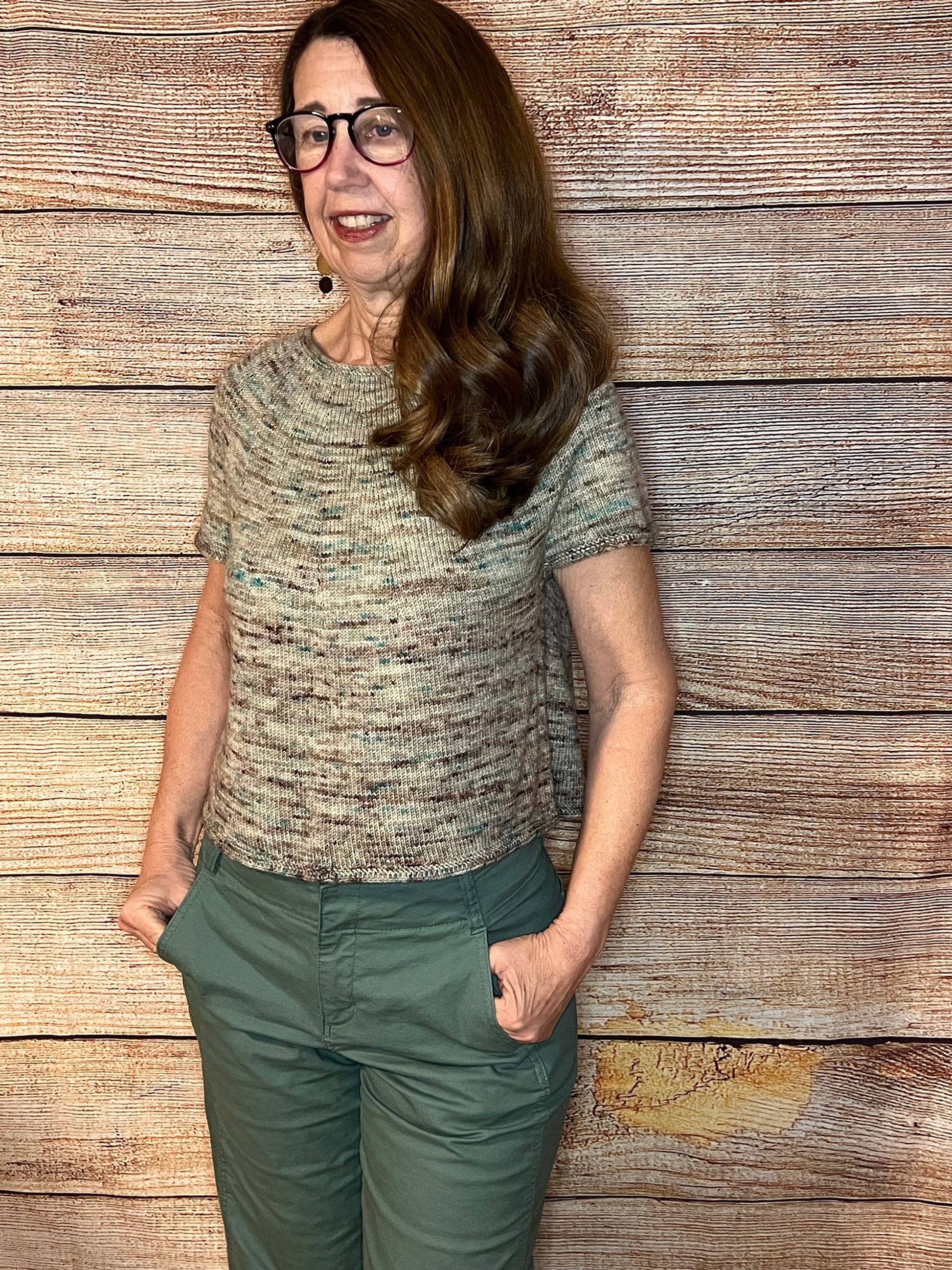 The sweater is worked in stockinette stitch. The hem and sleeves are finished with garter stitch followed by an I-cord BO. The pullover, including the sleeves, has positive ease for a breezy and comfortable fit.