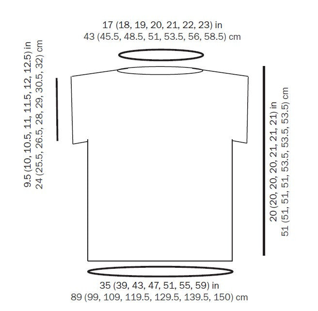 Bust: 35 (39, 43, 47, 51, 55, 59) in/89 (99, 109, 119.5, 129.5, 139.5, 150) cm