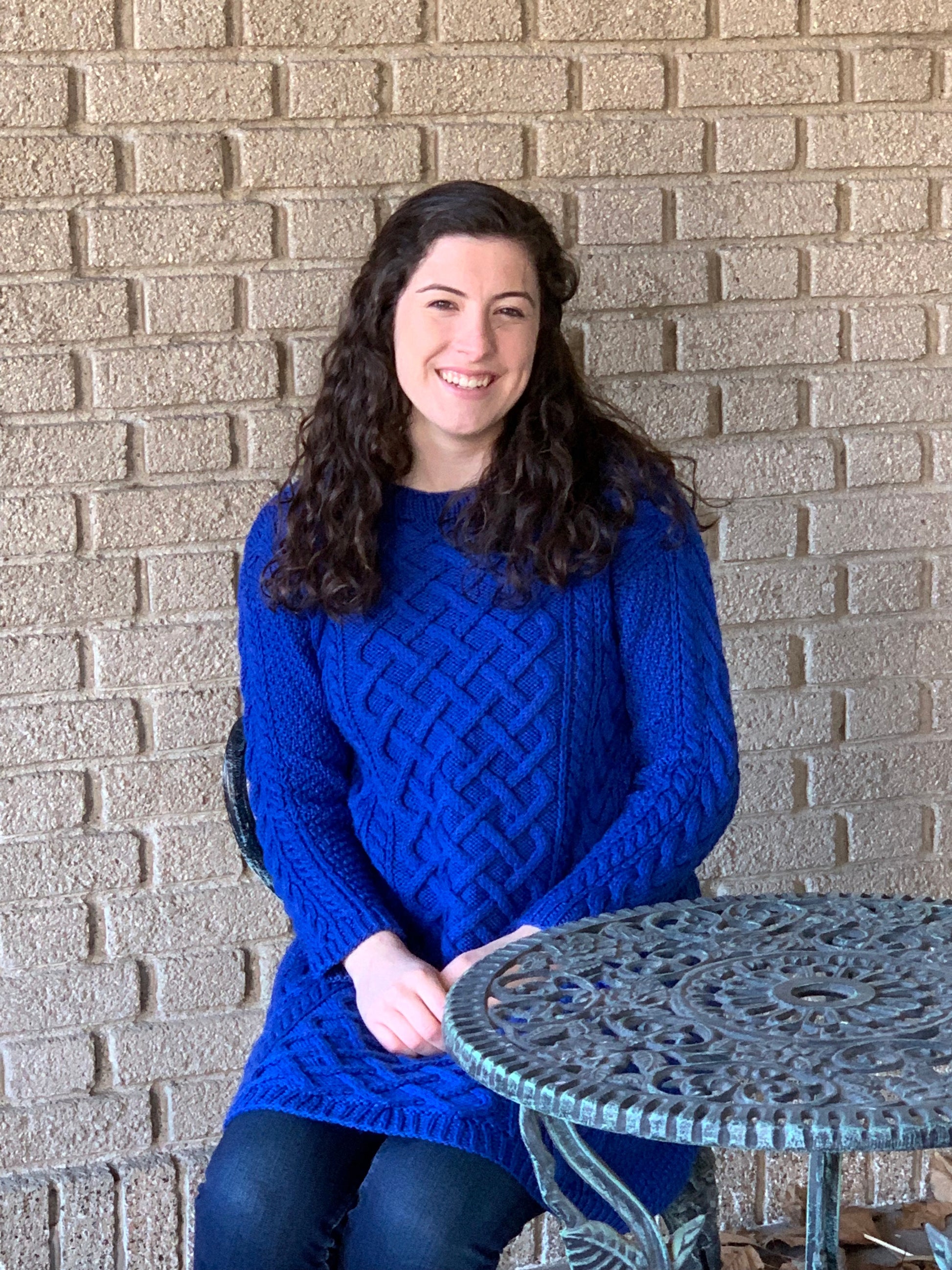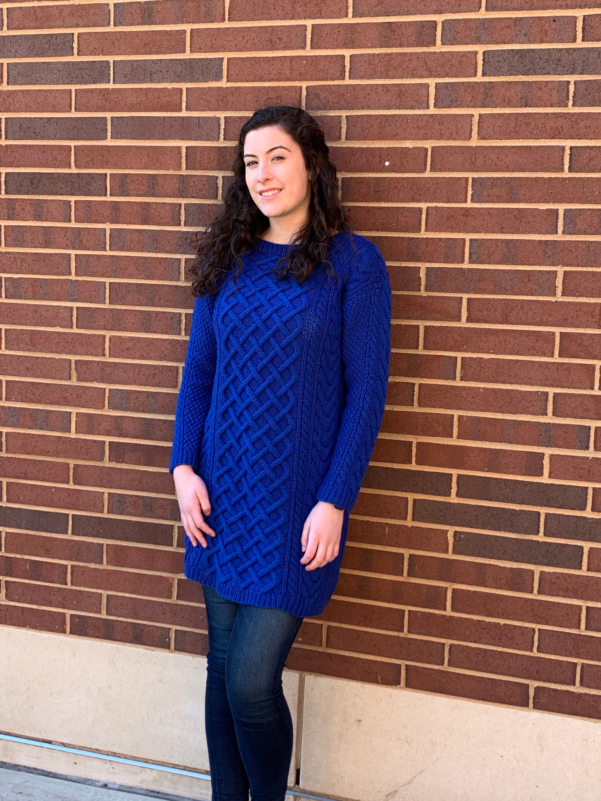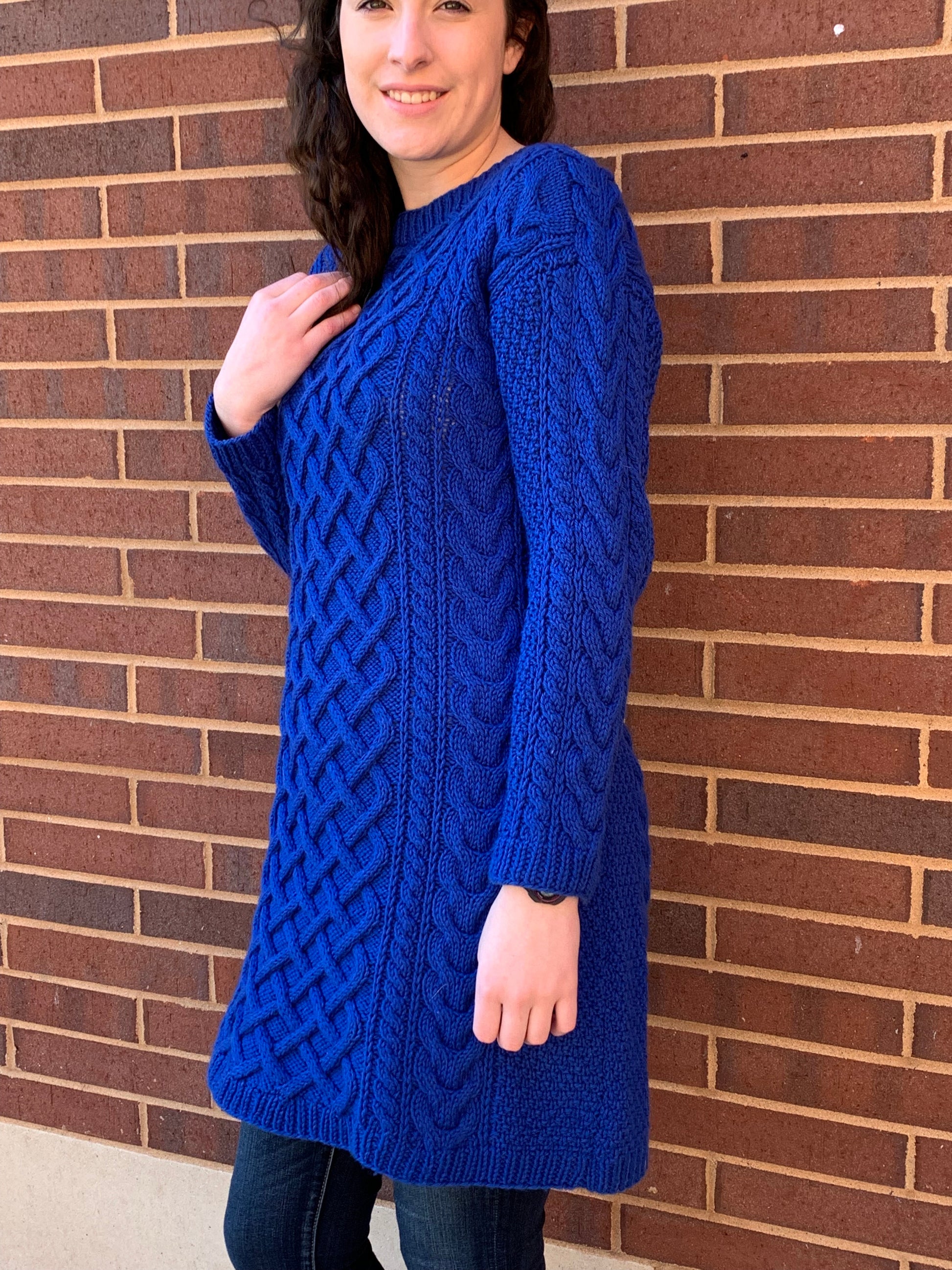 The Scottish Ale II is knit with worsted-weight yarn and knit on larger needles than the original. It is tunic length, so it requires more drape. It is also shaped to be wider at the hips than at the bust. Not all women need that extra room at the hips, but many of us do. If you don’t, then you can use the bust numbers for your cast-on numbers, and you can eliminate the shaping.