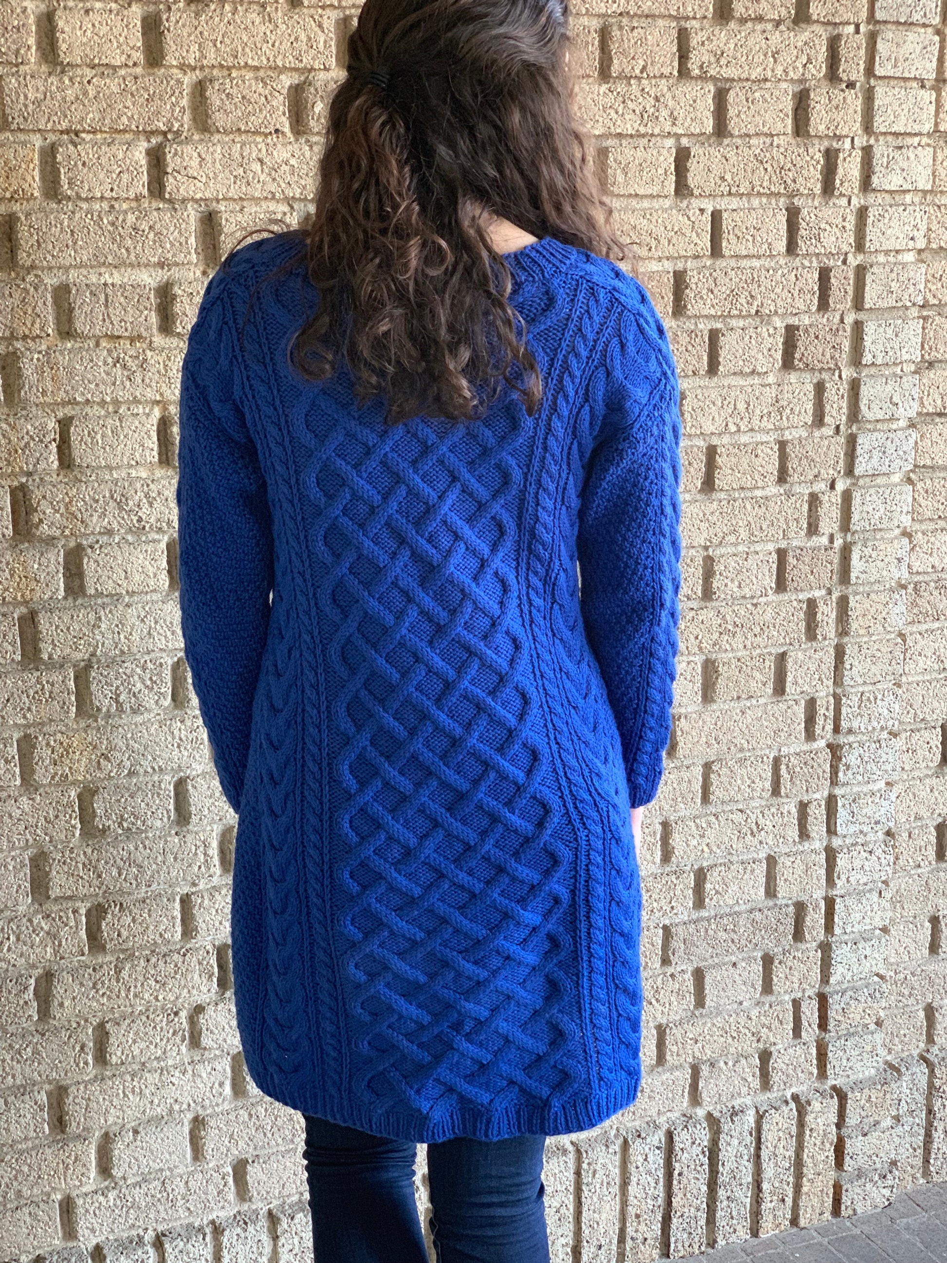 Scottish Ale II is worked in pieces from the bottom up. It has a saddle on the shoulder and has drop sleeves. The center cable pattern is now a traveling cable rather than closed circles, while the other cables are exactly how they are in the original sweater.