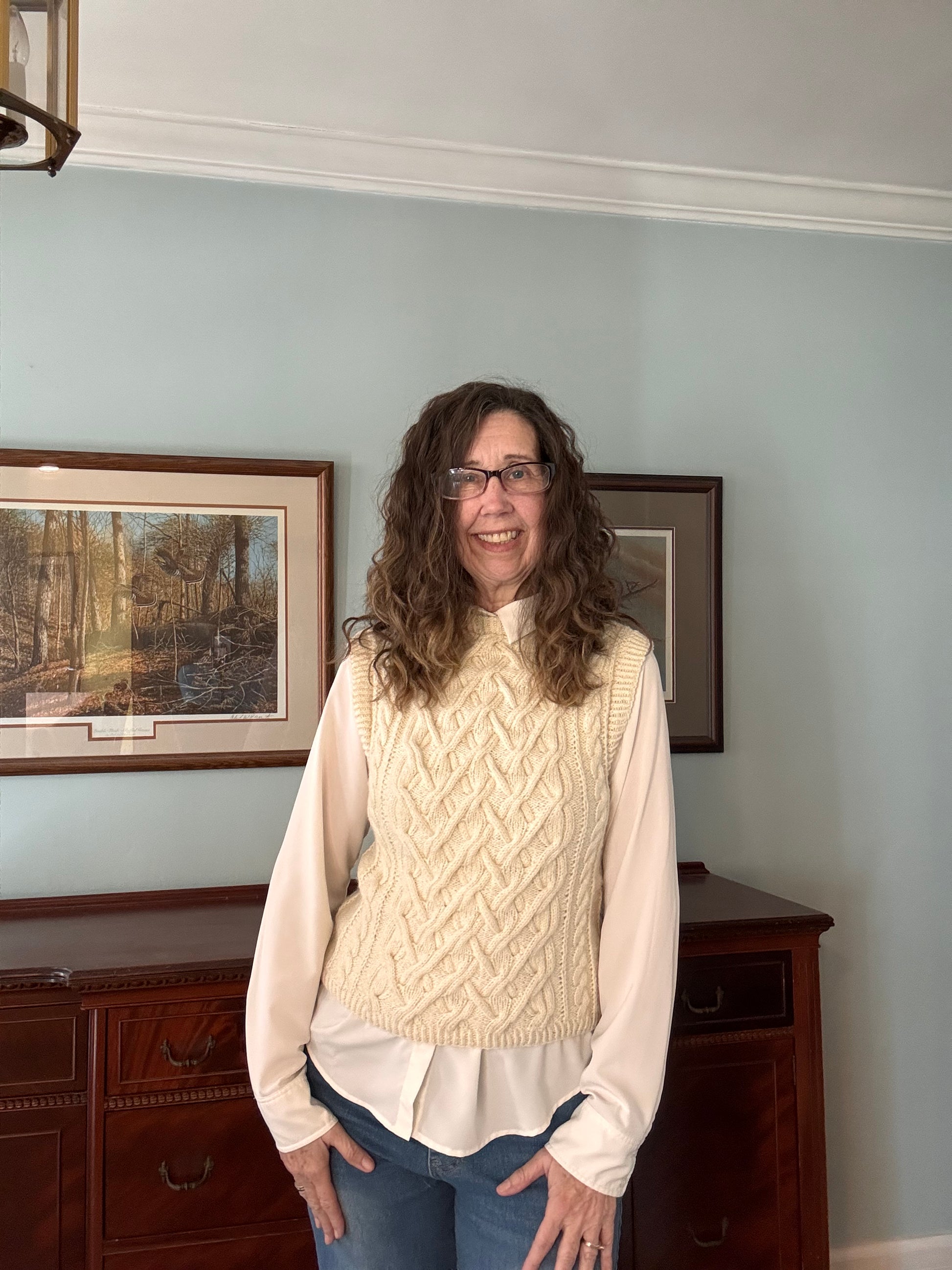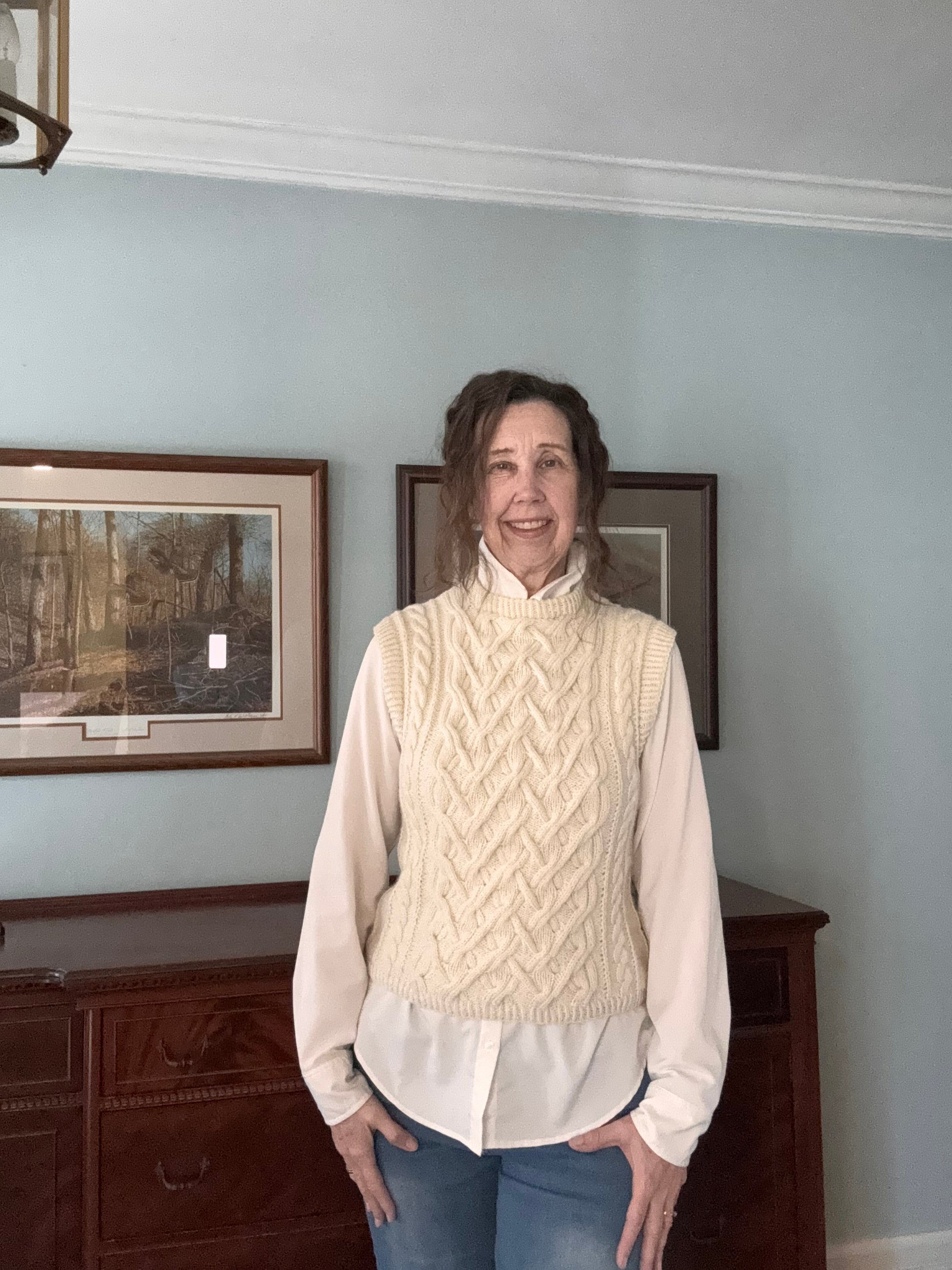 Tracks in the Snow is a cable slipover knit in sport-weight yarn in the round from the bottom up. The cable pattern reminds me of cross country skiing when you have to climb a hill on the trail.